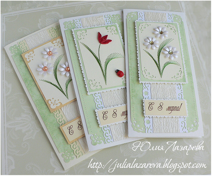 Листья - ручная вышивка по картону мелаллизированной нитью, техника "изонить". Серединка ромашек - стразы или жемчуг на выбор. Тюльпан - техника квилинг (бумагокручение).