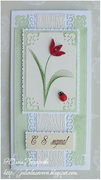 Листья - ручная вышивка по картону мелаллизированной нитью, техника "изонить". Серединка ромашек - стразы или жемчуг на выбор. Тюльпан - техника квилинг (бумагокручение).