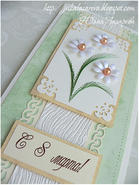 Листья - ручная вышивка по картону мелаллизированной нитью, техника "изонить". Серединка ромашек - стразы или жемчуг на выбор. Тюльпан - техника квилинг (бумагокручение).
