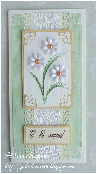 Листья - ручная вышивка по картону мелаллизированной нитью, техника "изонить". Серединка ромашек - стразы или жемчуг на выбор. Тюльпан - техника квилинг (бумагокручение).